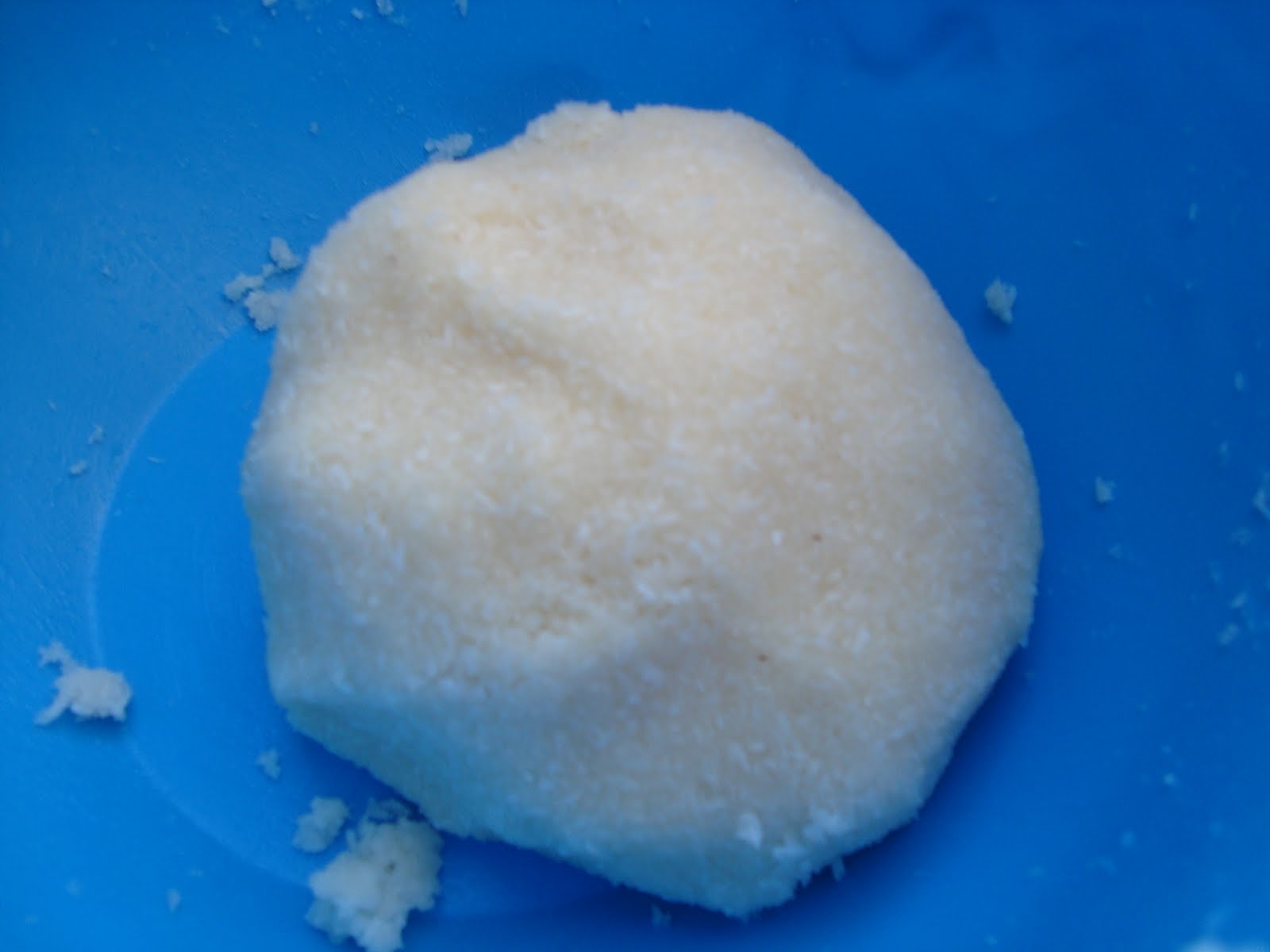 Amestecam cocosul cu zaharul si oul si framantam bine cu mainile pana ce compozitia capata o consistenta omogena.