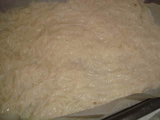 Se tapeteaza o tava cu hartie de copt si se intinde pe fundul tavii jumatate din cantitatea de spaghette
