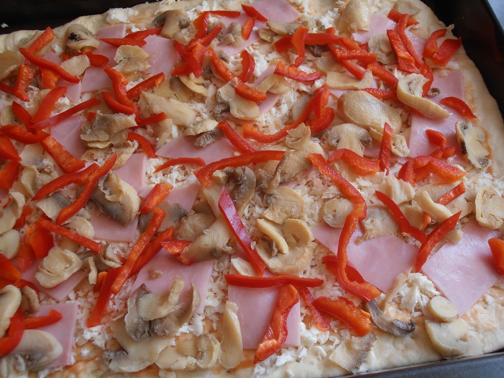 Presaram un sfert din casul ras apoi repartizam uniform pe toata suprafata feliile de sunca taiate in patru, ciupercile si ardeiul taiat fasii.