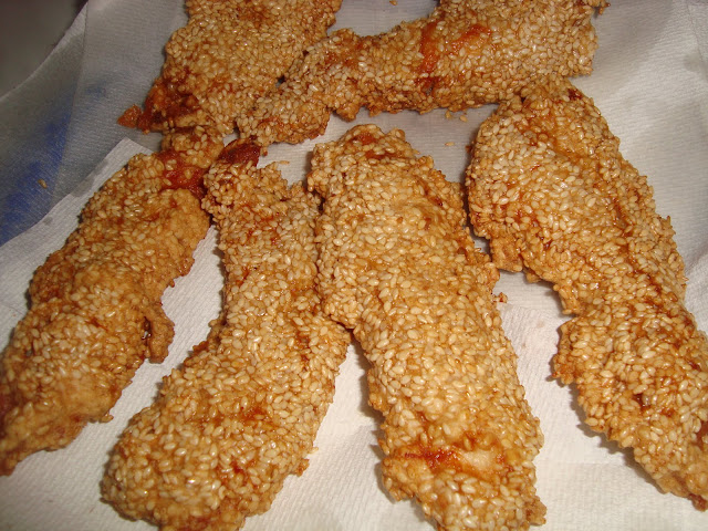 Se face un amestec din oua, amidon, mustar si 2 linguri sos soia si se tavalesc bucatile de piept prin el.