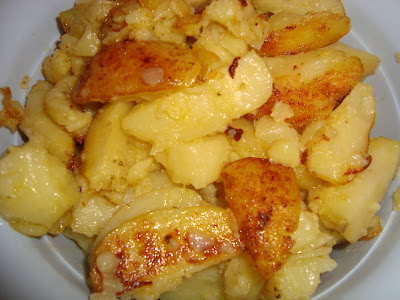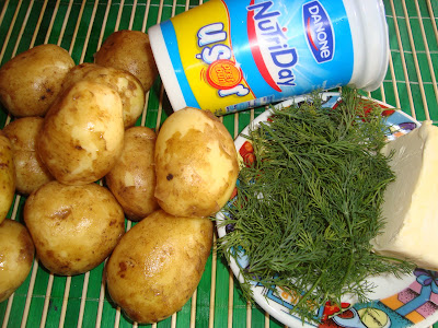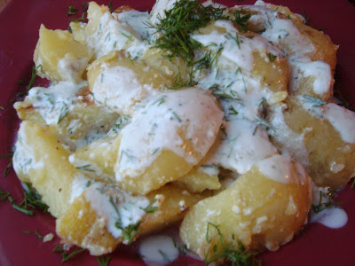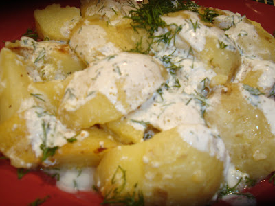 Se toarna sosul peste cartofi si se presara cu marar verde tocat marunt.