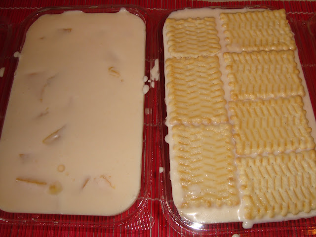 Se toarna peste piersici compozitia apoi se aseaza deasupra biscuitii inmuiati putin in zeama de compot.