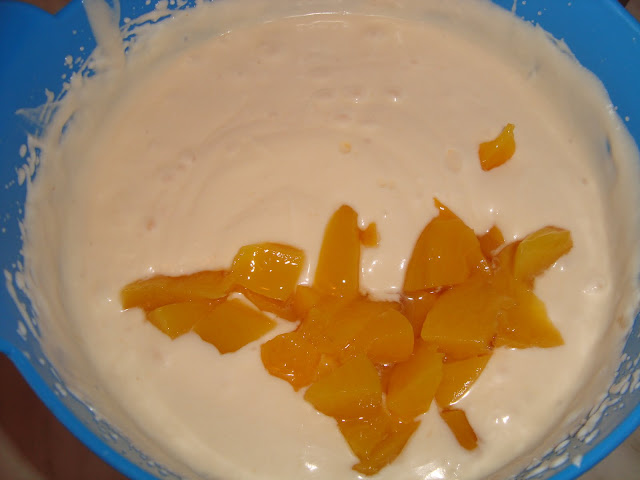 Se adauga iaurturile si se bate in continuare.Adaugam apoi doua trei piersici taiate cubulete.Dizolvam gelatina in cateva linguri de compot si o punem pe foc cateva secunde pana se topeste.Mare atentie, nu trebuie adusa la punctul de fierbere pentru ca isi pierde proprietatile.Se incorporeaza in compozitie.