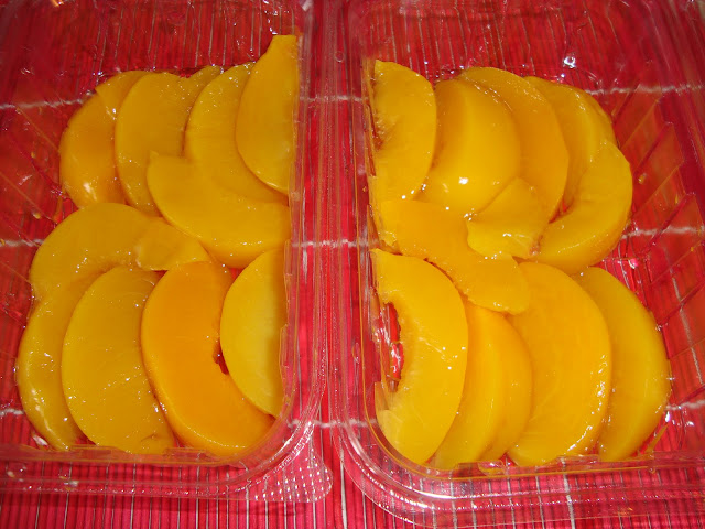 Se aseaza pe fundul unor recipiente feliile de piersici.Eu am folosit recipiente de unica folosinta ca sa fiu sigura ca o sa pot scoate prajitura fara sa se deterioreze.