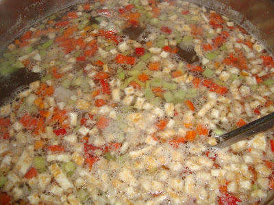 Se adauga ceapa, morcovul, pastarnacul si ardeiul tocate marunt si se lasa sa fiarba.