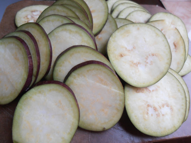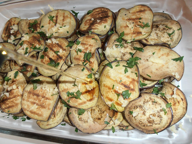 Punem intr-un vas un strat de vinete, apoi presaram sare si piper, adaugam usturoi pisat si patrunjel tocat marunt.Repetam operatiunea pana terminam vinetele .