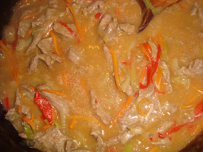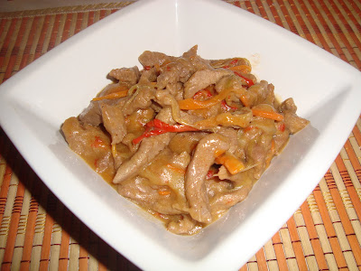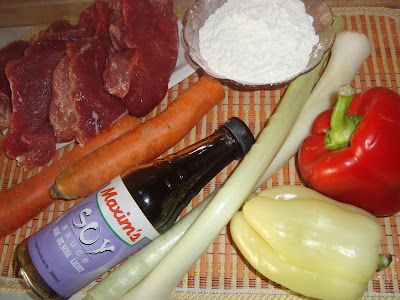Se taie carnea de vita fasii subtiri si se lasa 1-2 ore la marinat in sosul de soia.