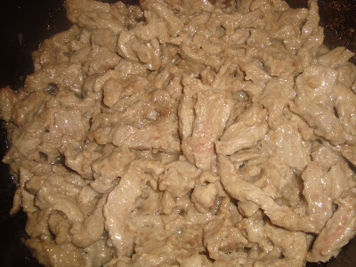 Se tavaleste carnea prin amidon si se prajeste in putin ulei