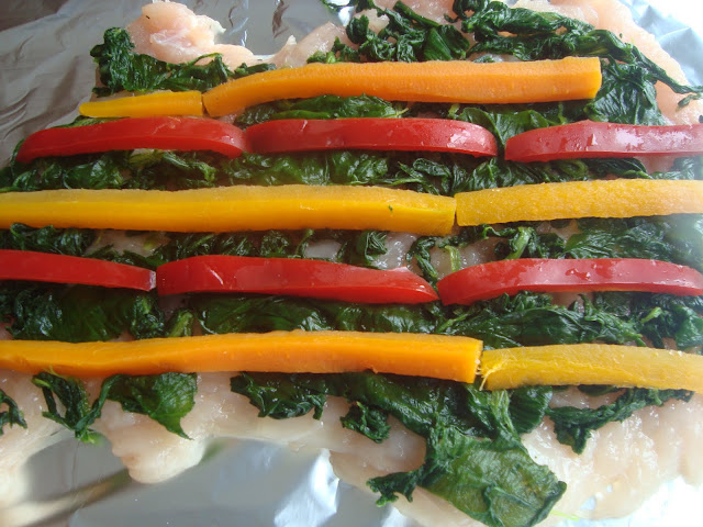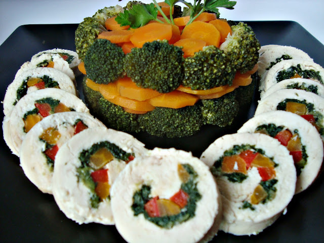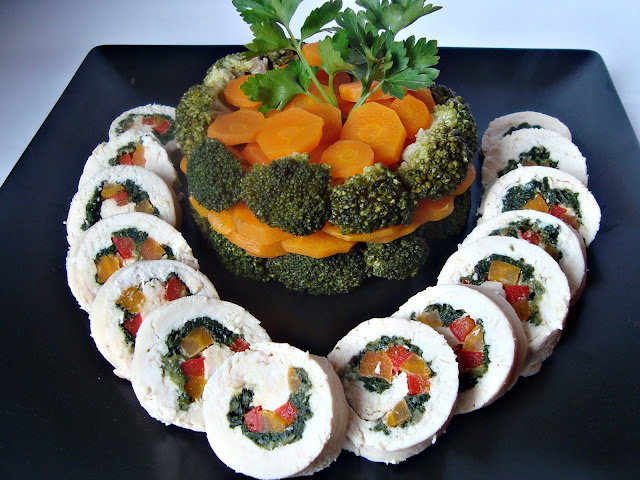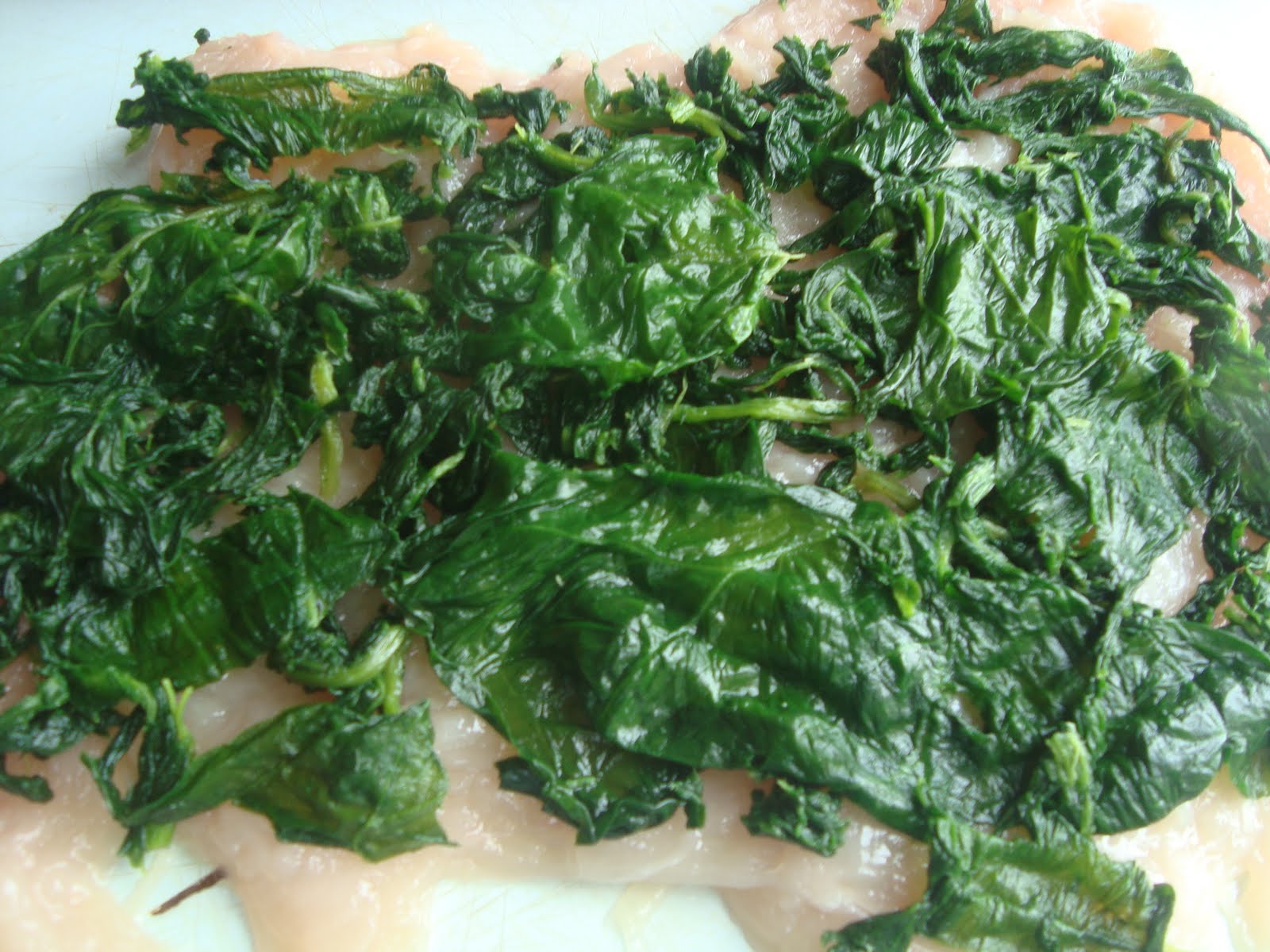 Oparim spanacul (doar cat il scufundam in apa fierbinte ) si il scoatem apoi in apa cu gheata ca sa isi mentina culoarea . Intindem un strat de spanac pe pieptul de pui.