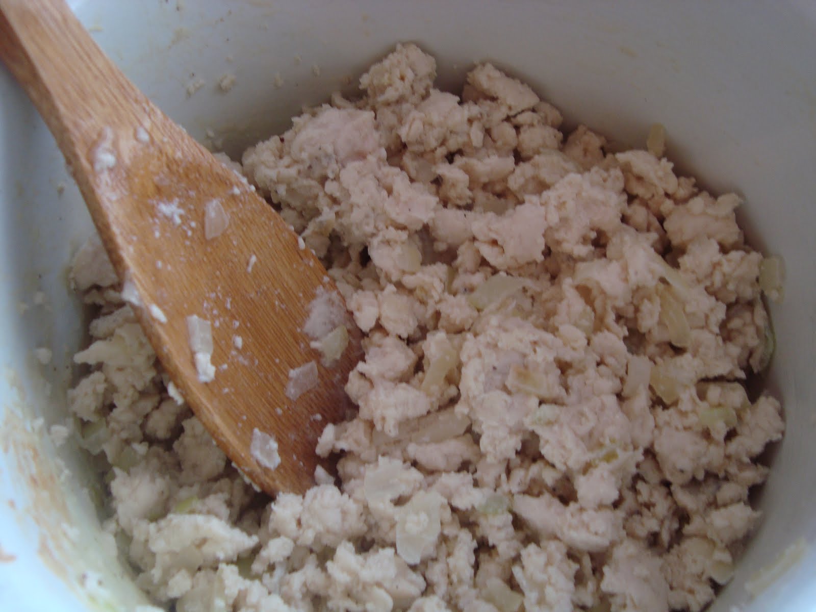 Se toaca ceapa si se caleste intr-o lingura de ulei.Se adauga pieptul si se lasa pe foc pana ce pieptul incepe sa se albeasca.