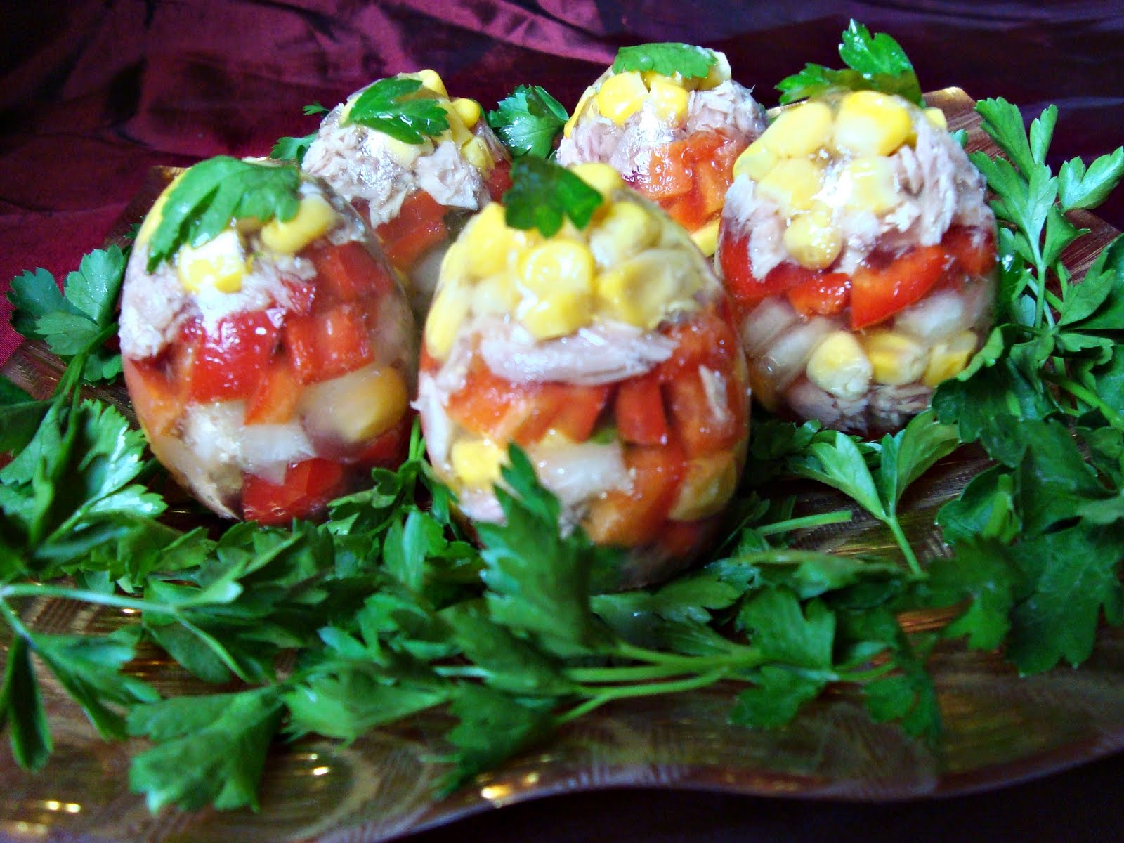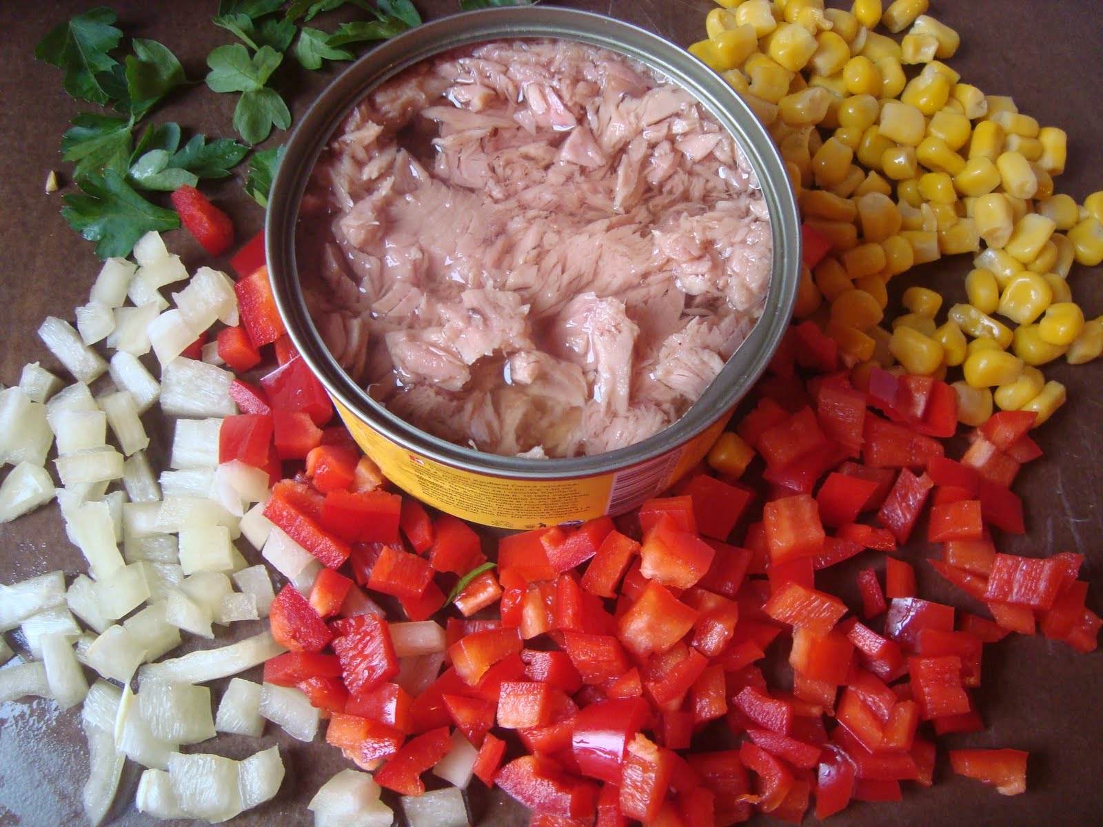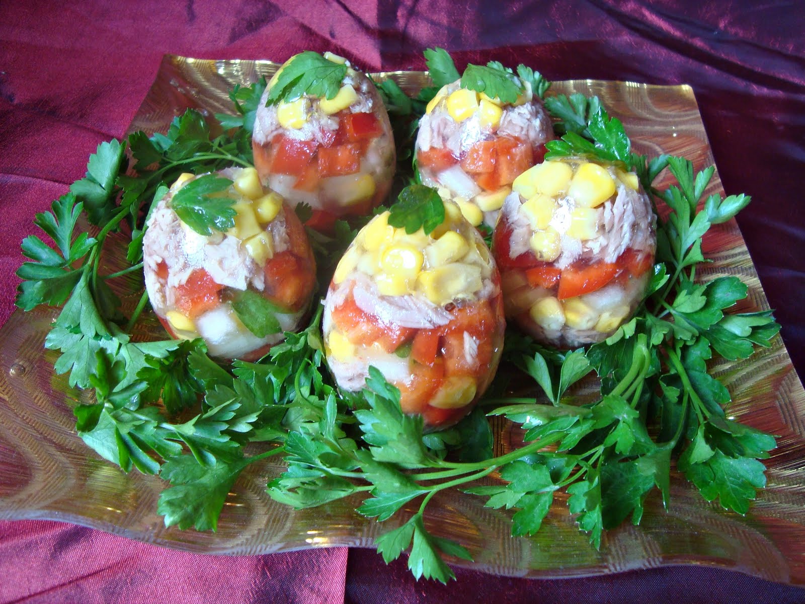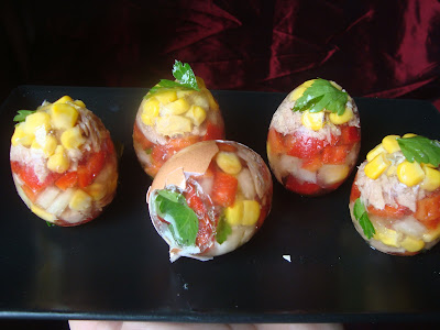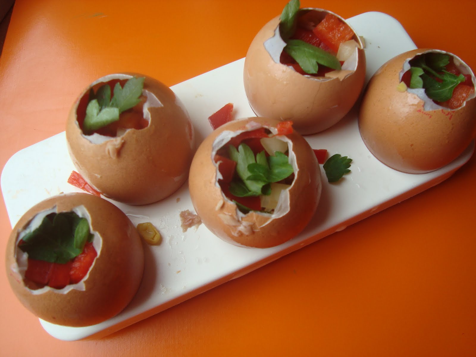 Asezam mai intai in fundul cojii de ou o frunzulita de patrunjel. Adaugam apoi cateva boabe de porumb apoi alternam un strat de ton , unul de ardei gras rosu, din nou ton, apoi porumb, ardei gras galben , ton ,porumb , pana ce oul este aproape plin.Deasupra punem doua trei frunzulite de patrunjel .