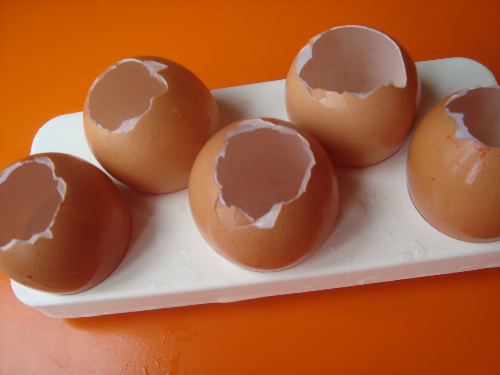 Cu foarte mare atentie ciocnim oul la baza si cu ajutorul unui cutitas facem o deschizatura nu foarte mare. Extragem cu atentie continutul iar cojile le spalam foarte bine si le punem la scurs . Le asezam apoi pe un suport. Eu am folosit suportul de oua de la frigider, daca nu aveti puteti folosi foarte bine si un carton de oua .